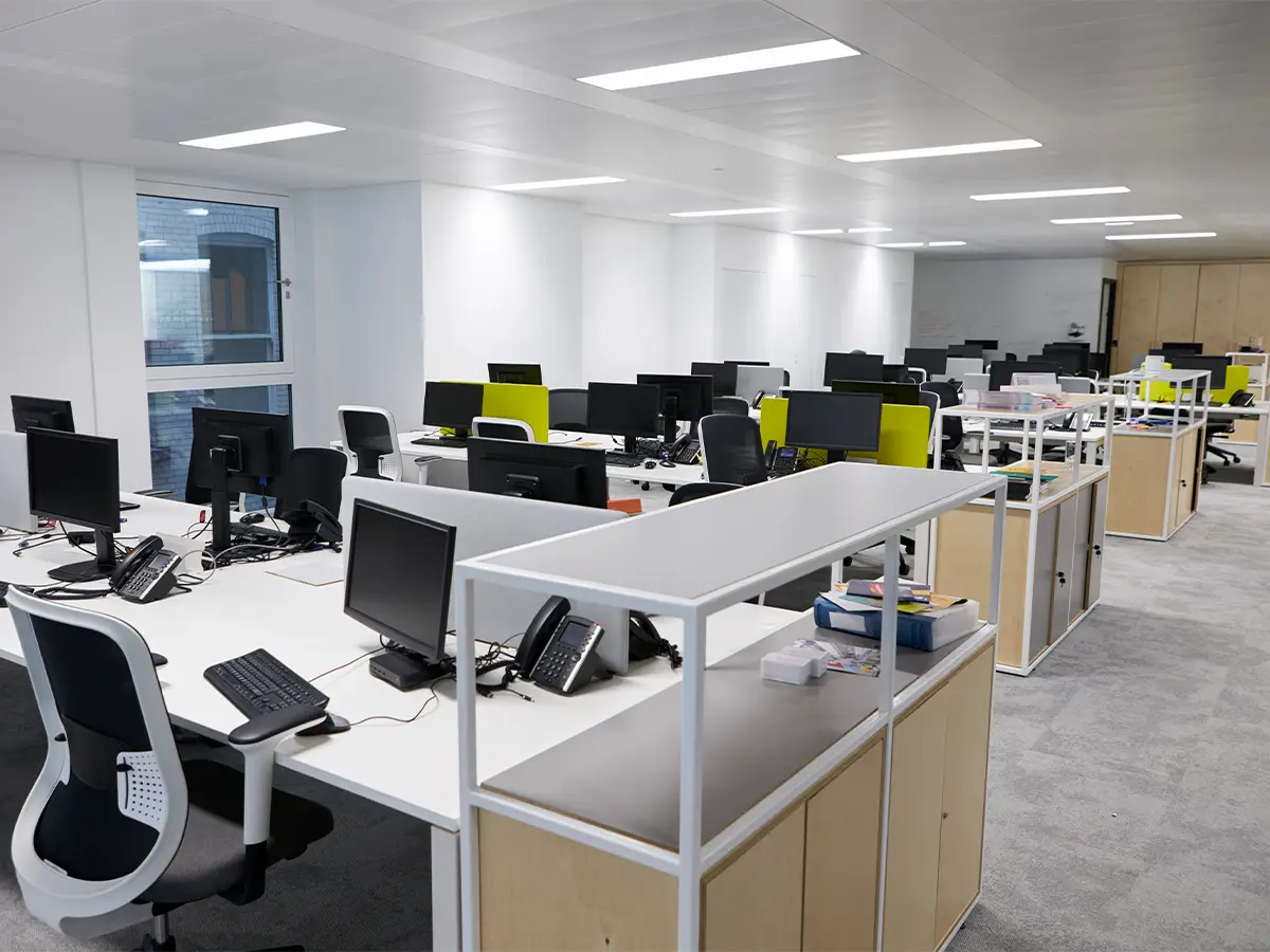 Yes – all offices should use qualified electricians. Safe isolation, correct drivers / dimming, control compatibility and appropriate emergency coverage all must be ensured. Our team carries out design, supply and installation in full from start to finish, including testing and handover, and installing LED solutions to current best practice.